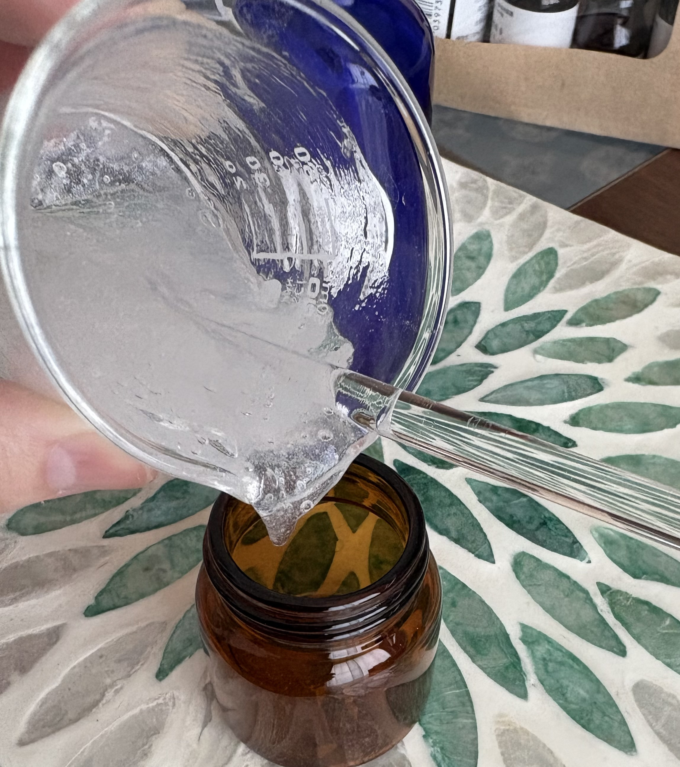 ガラス棒ですり潰し、無水エタノール、精油を加え